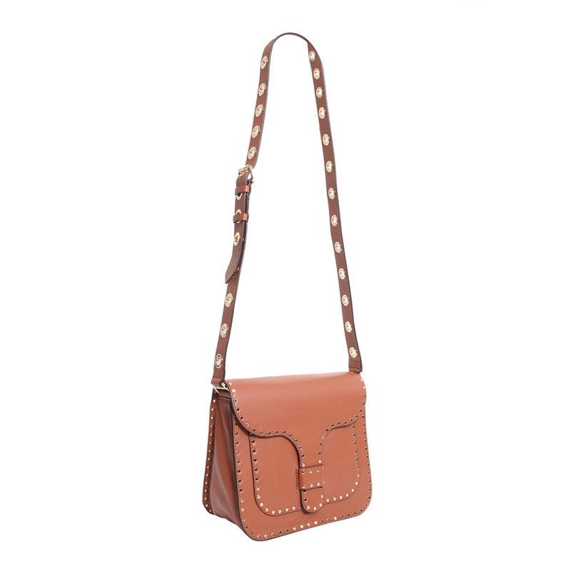 - ADJUSTABLE CROSSBODY STRAP WITH BUCKLE - FLAP CLOSURE - ADORNED WITH METAL STUDS AND EYELETS - ONE FRONT AND BACK SLIT POCKET - INTERNAL: THREE CREDIT CARD SLOTS, ONE SLIT AND ONE ZIP POCKET - GOLD COLORED METAL HARDWARE - COTTON LINING - SIZE: 22 X 22.5 X 12.5 CM - 100% LEATHER