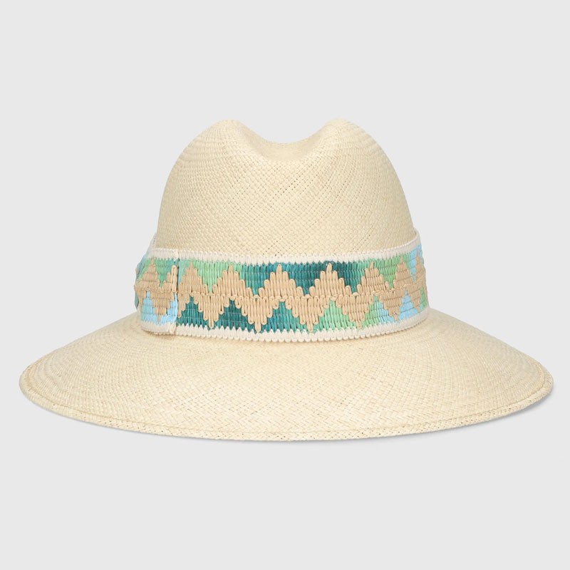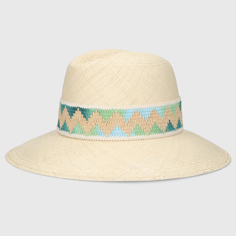 The Claudette Panama Quito hat combines style and elegance. Constructed with the Panama Quito weave, it charms with its light weight and timeless look. The 2 in (5 cm) zig-zag raffia hat band adds a playful, distinctive touch to the elegant silhouette of this style. The brim is about 3½ in (9 cm) wide.