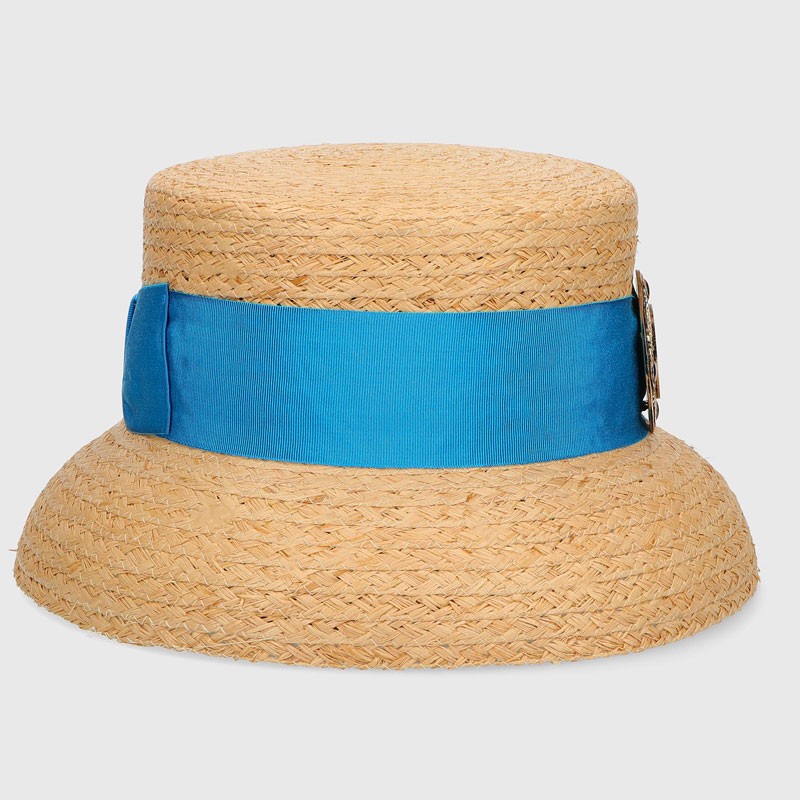 "Audrey" Raffia braided , medium brim 6 cm., grosgrain hatband 5 cm., brass logo brooch.