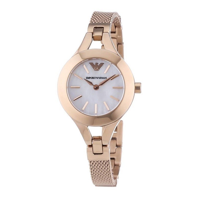 Rose gold-tone stainless steel case with a beige leather strap. Fixed rose gold-tone bezel. Warm grey dial with rose gold-tone hands and crystal-set index hour markers. Roman numerals mark the 3, 6 and 9 o'clock positions. The Emporio Armani logo appears at the 12 o'clock position. Dial Type: Analog. Quartz movement. Scratch resistant mineral crystal. Pull / push crown. Solid case back. Case diameter: 32 mm. Case thickness: 7.5 mm. Round case shape. Band width: 14 mm. Tang clasp. Water resistant at 50 meters / 165 feet. Functions: hour, minute. Casual watch style. Emporio Armani Retro Warm Grey Dial Beige Leather Strap Ladies Watch AR1681.