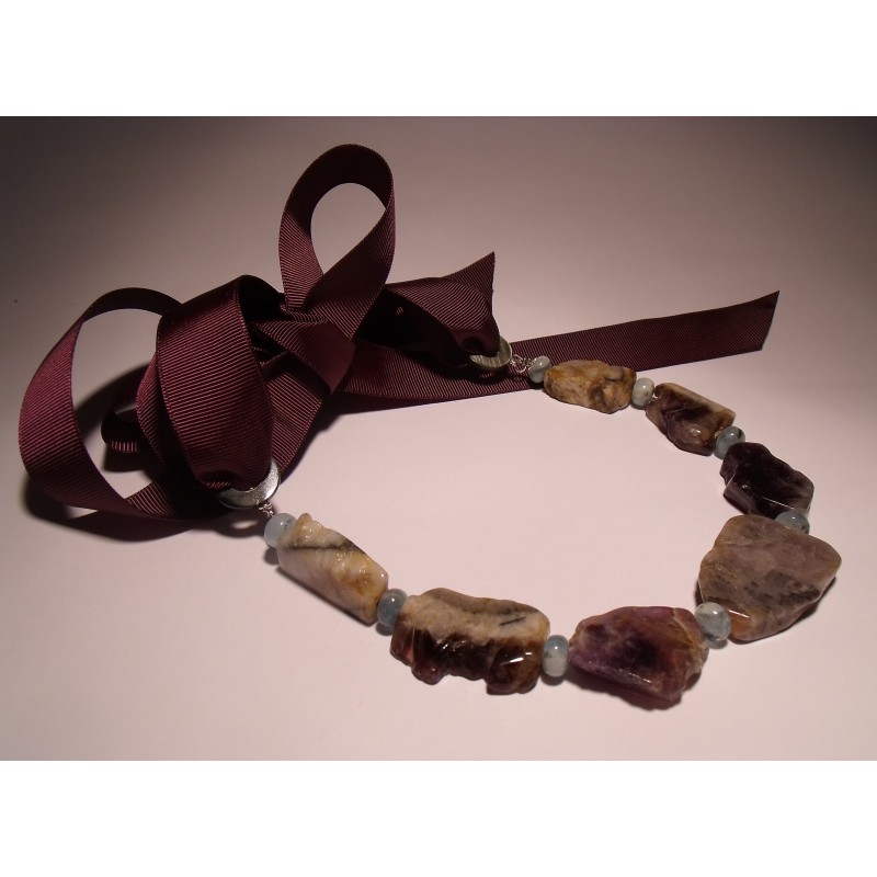 Necklace with rough amethyst and aquamarine. Closure with rings of mother of pearl and purple grosgrain ribbon