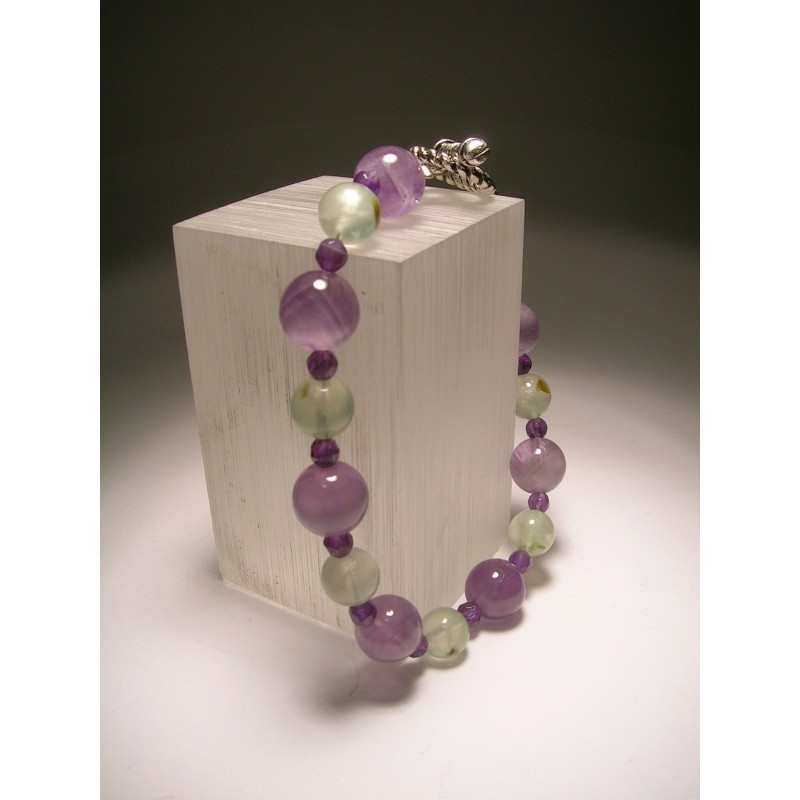 Bracelet with amethyst and prehnite. Nickel free steel closure