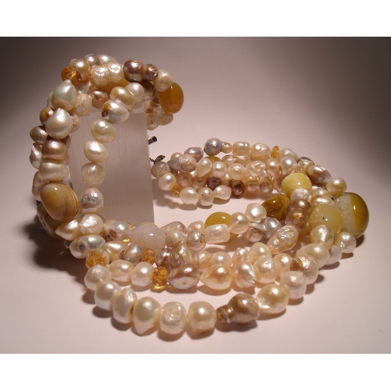 Necklace of five strands with freshwater pearls, citrine quartz and agate. Nickel free steel closure