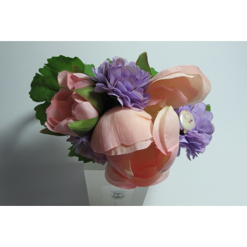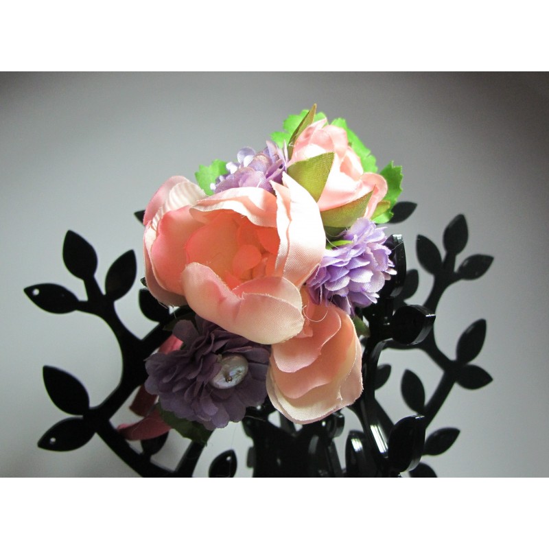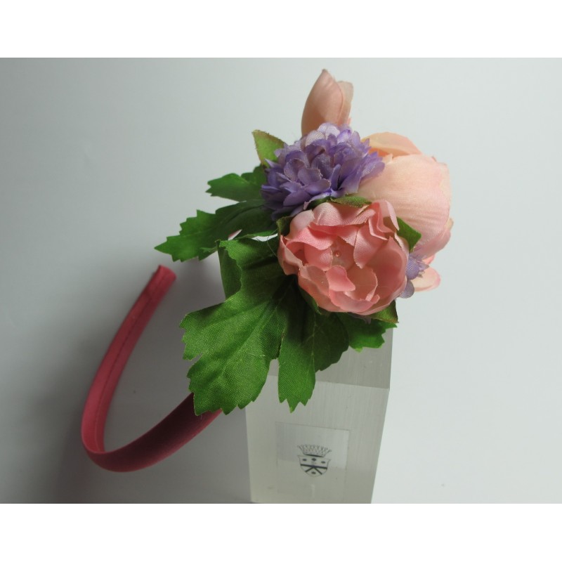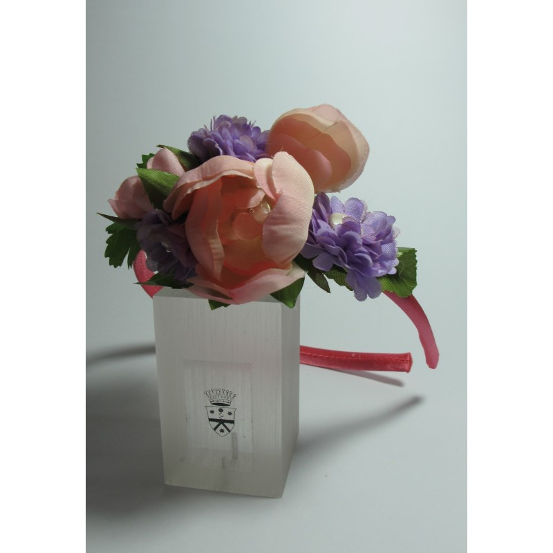 Headband in pink satin with flower and pearls