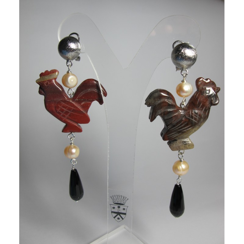 Earrings with rooster jasper, onyx and freshwater pearls. Rhodium plated brass support. Nickel free
