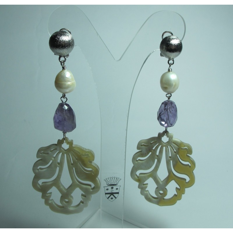 Earrings with carved horn, 1st quality freshwater pearls and amethyst. Rhodium plated brass support