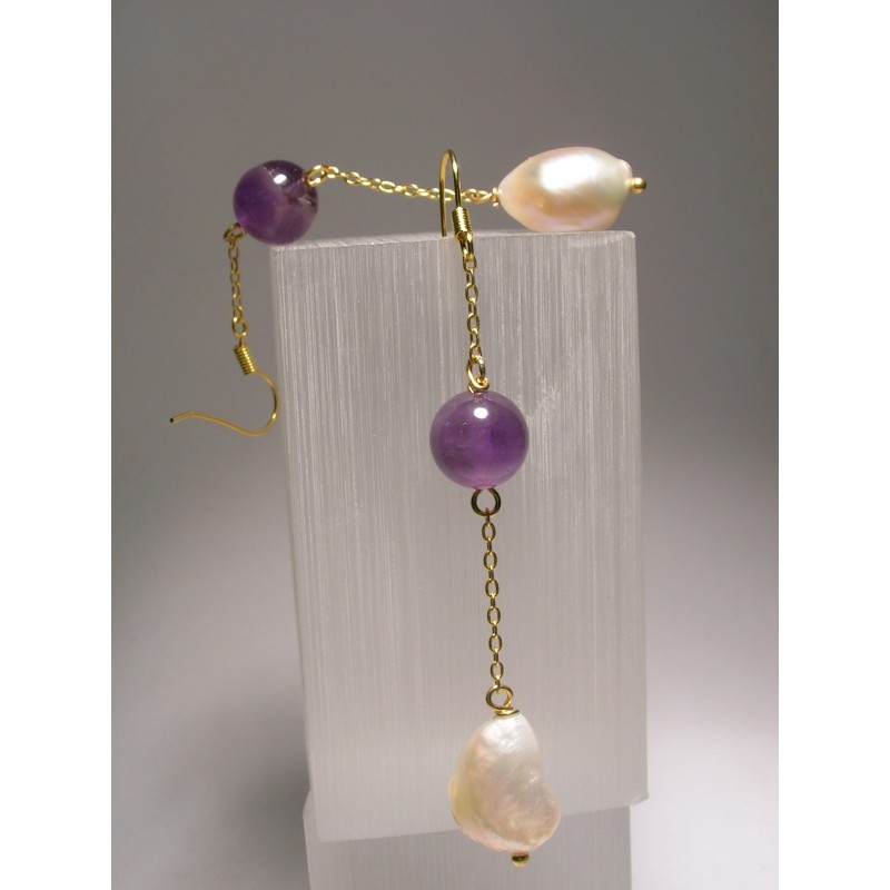 Earrings with 1st quality freshwater pearls and amethyst. Brass chain and support in nickel free plated steel