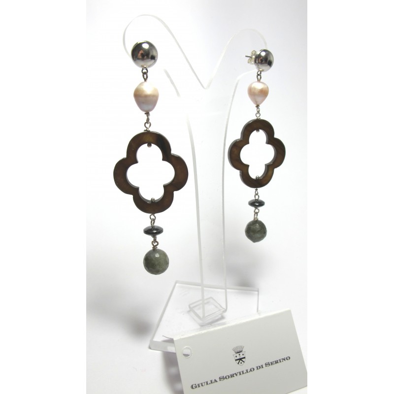 Earrings with pearls, mother of pearl, hematite and astrophyllite