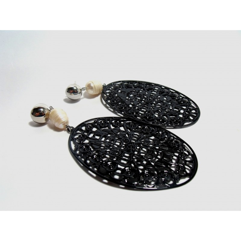 Earrings with 1st quality freshwater pearls and black enamelled steel oval. Nickel free steel support