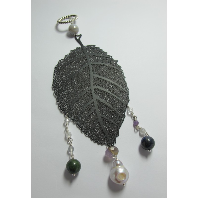 Pendant with 1st quality freshwater pearl, lapis lazuli, African jade, agate, gray quartz and amethyst on a metal leaf. Nickel free