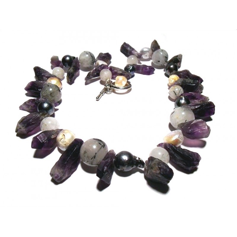 Necklace with amethyst, grey and white 1st quality freshwater pearls, tourmalinated quartz. Nickel free steel closure