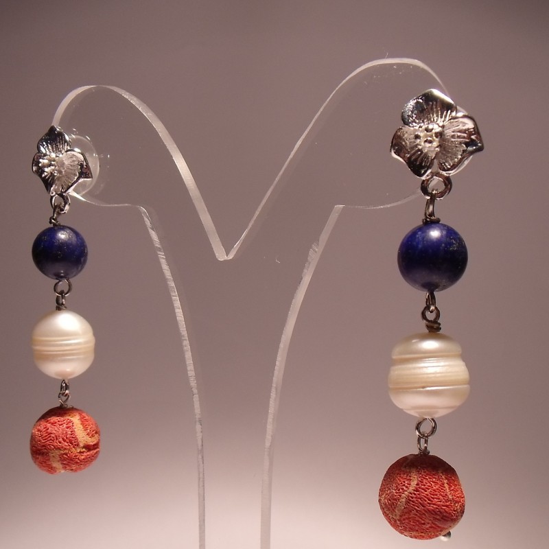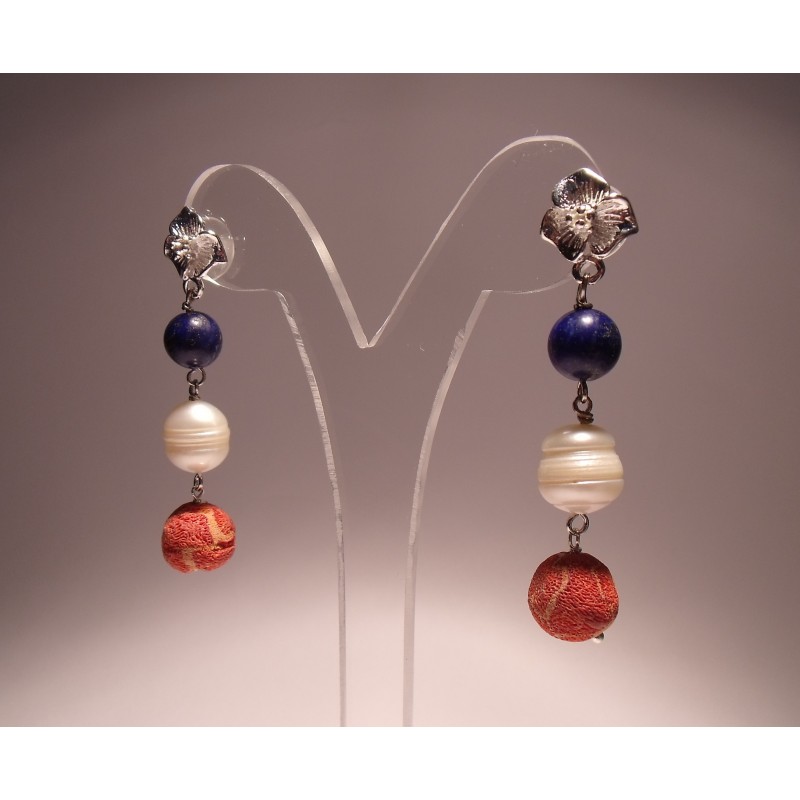 Silver earrings with 1st quality white freshwater pearls , madrepora and lapis lazuli