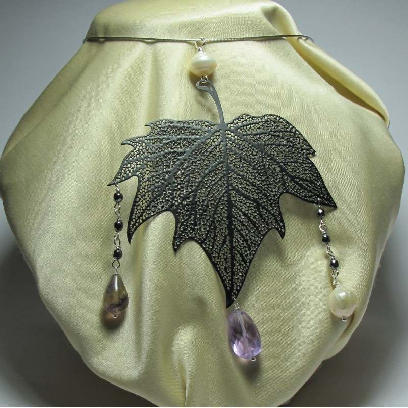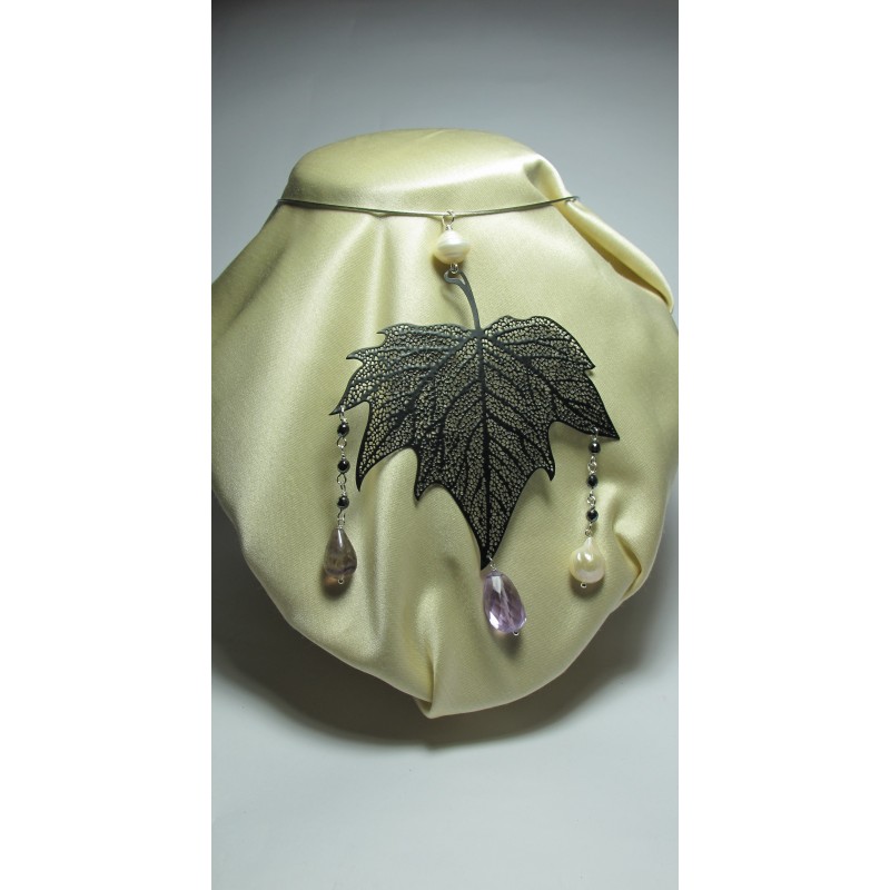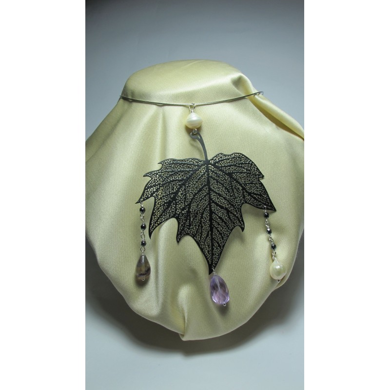 Pendant with 1st quality freshwater pearl, hematite, fluorite and amethyst on a enamelled metal leaf. Nickel free
