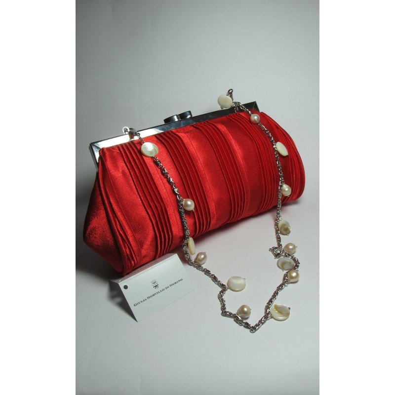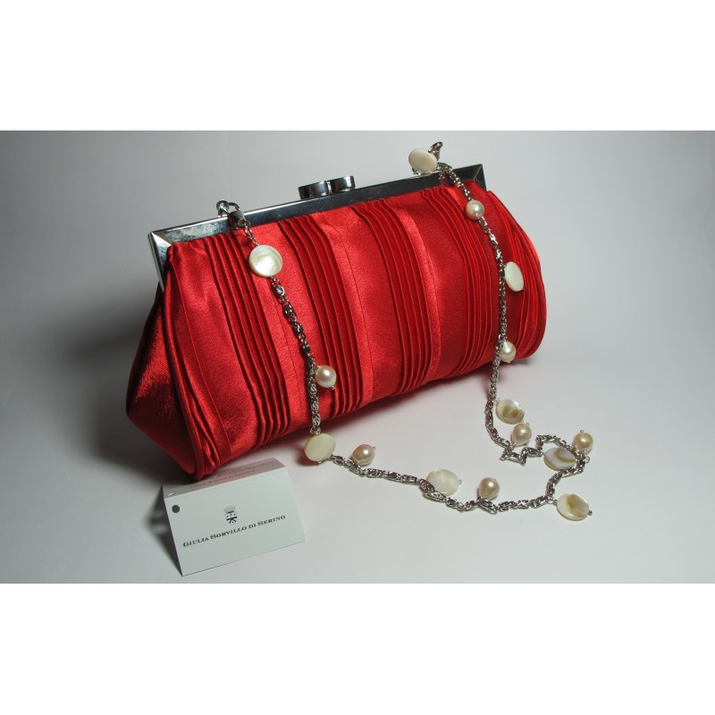 Red satin clutch with mother of pearl and white pearls
