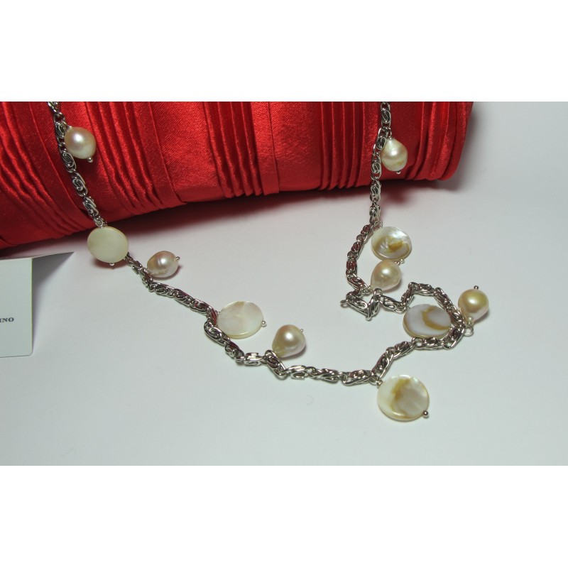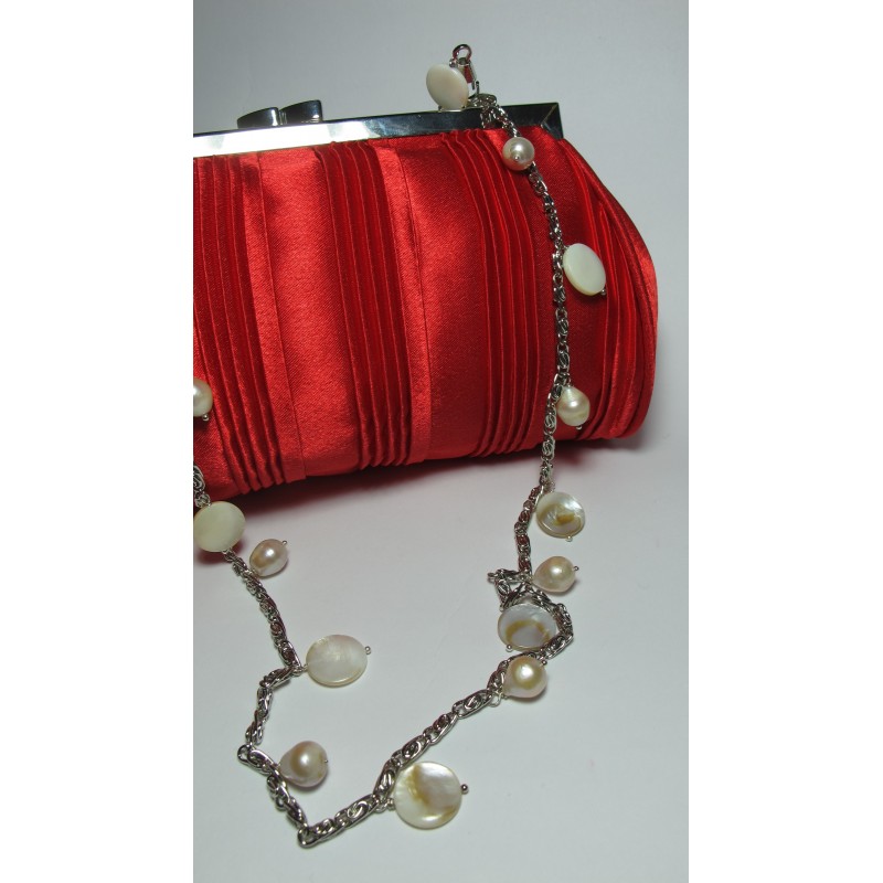 Red satin clutch with mother of pearl and white freshwater pearls