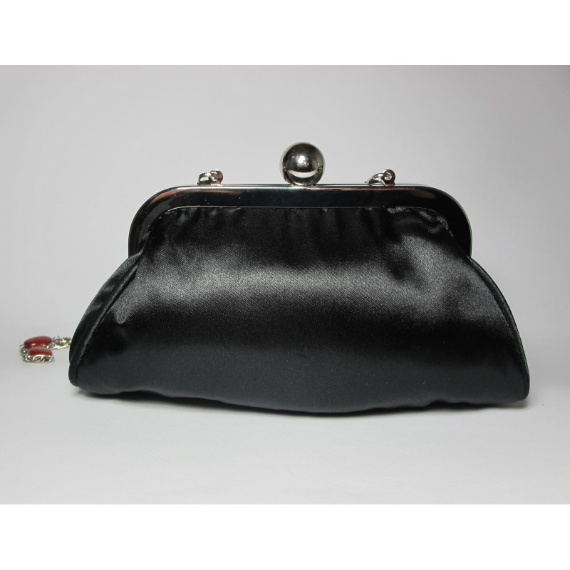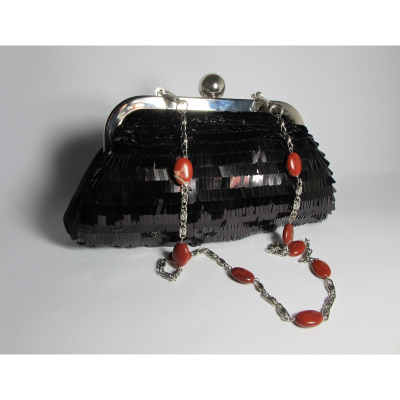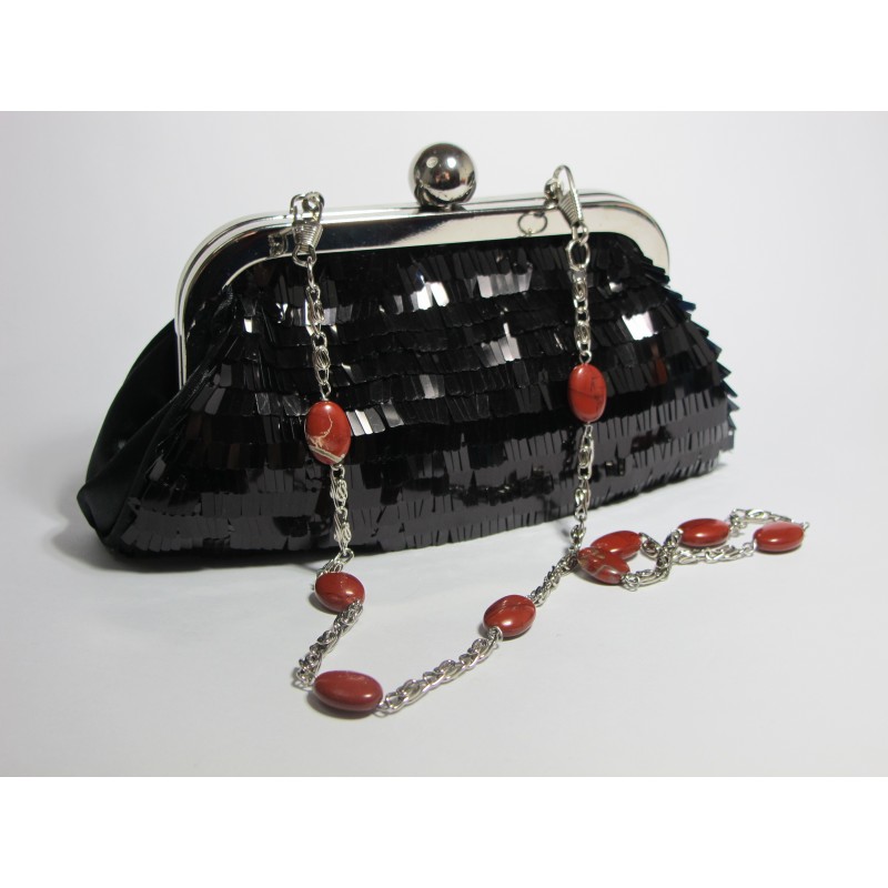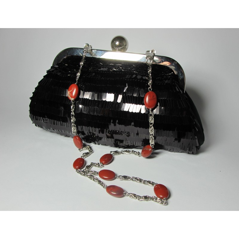 Black satin mini-clutch with pailletes and red jasper. Nickel free