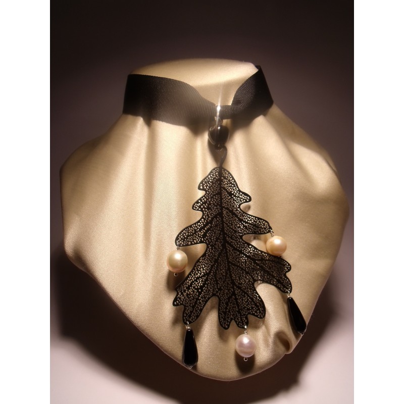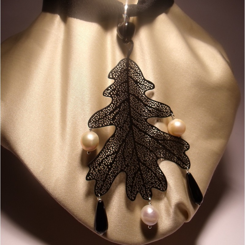 Metal leaf pendant with onyx and 1st quality freshwater pearls