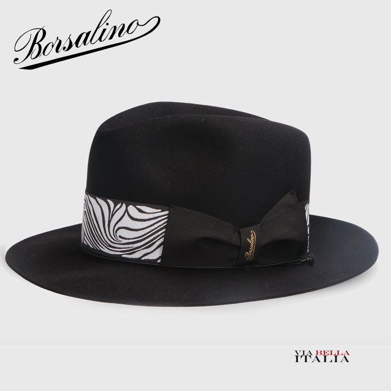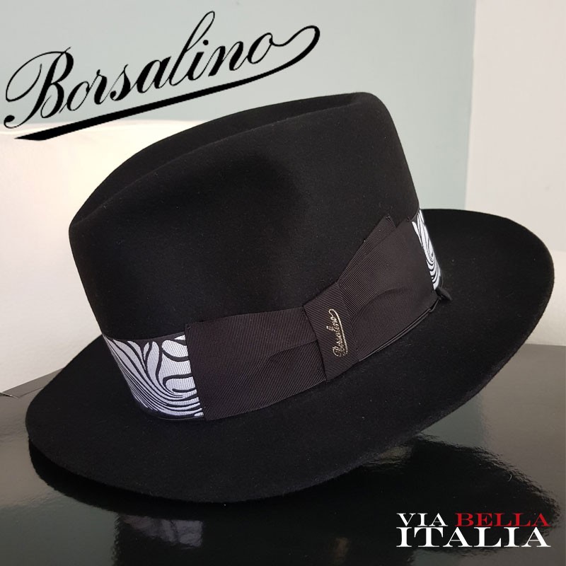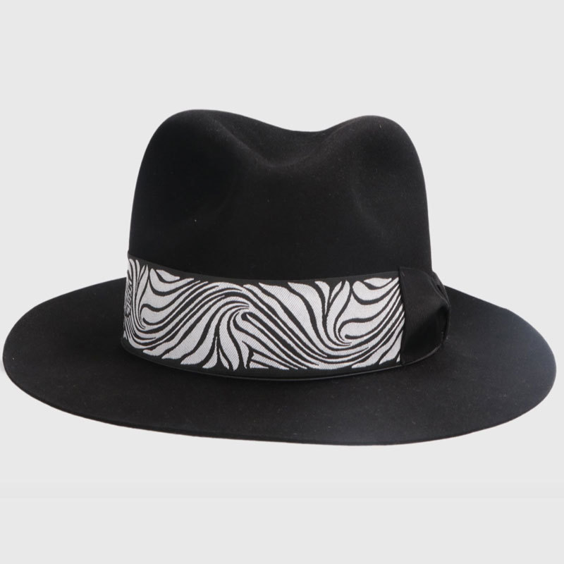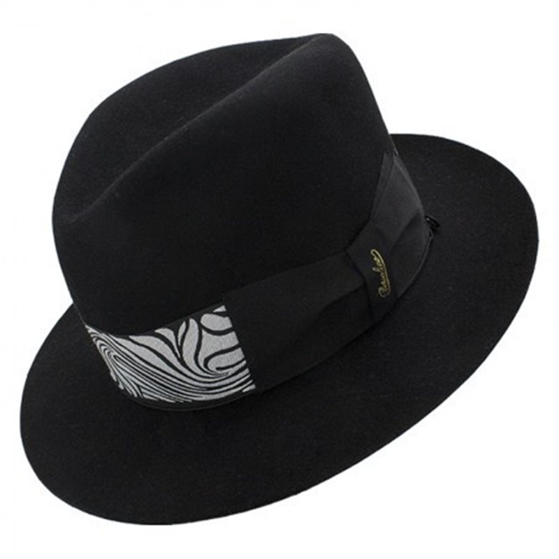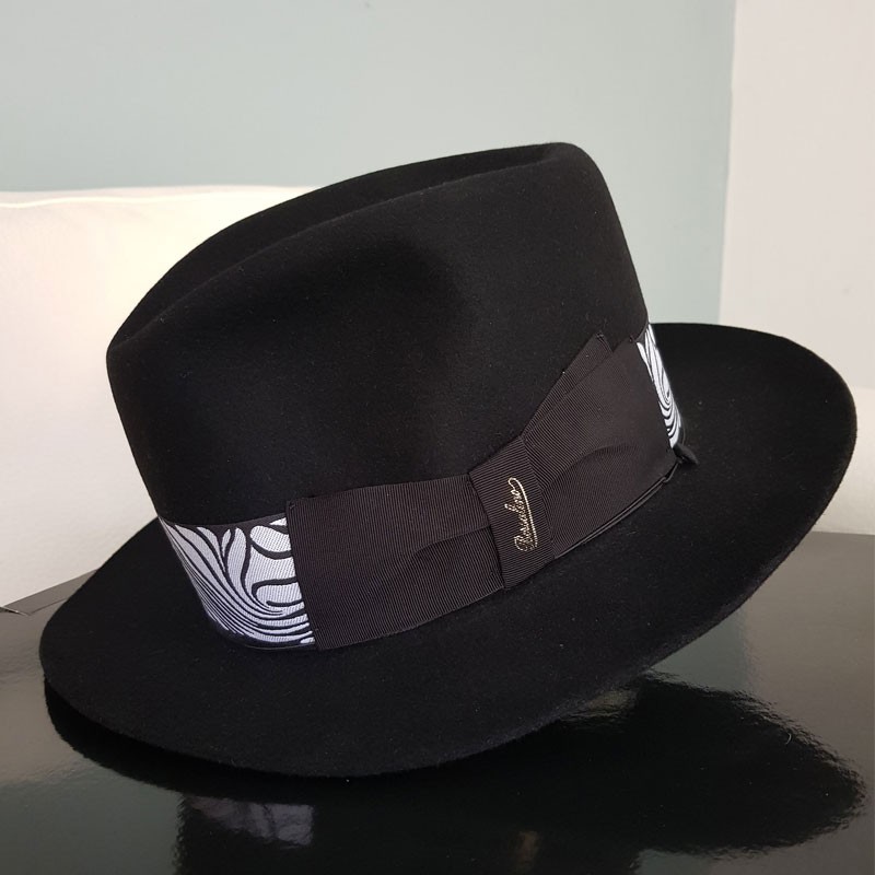 "Humphrey Bogart" Alessandria brushed felt, lined, medium brim (6,5 cm.),"waving tulip" pattern headband (5 cm.), elastic with small button, matching box. Color: BLACK Code: E392836A
