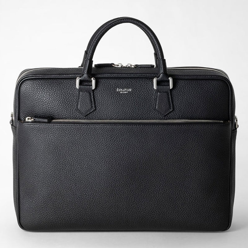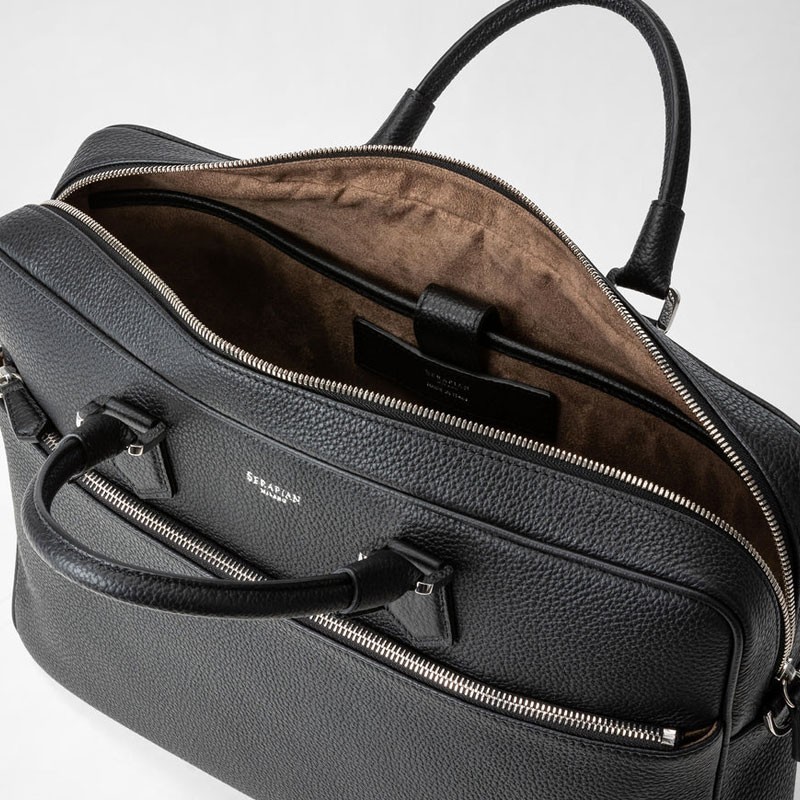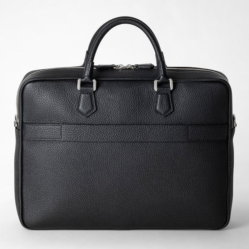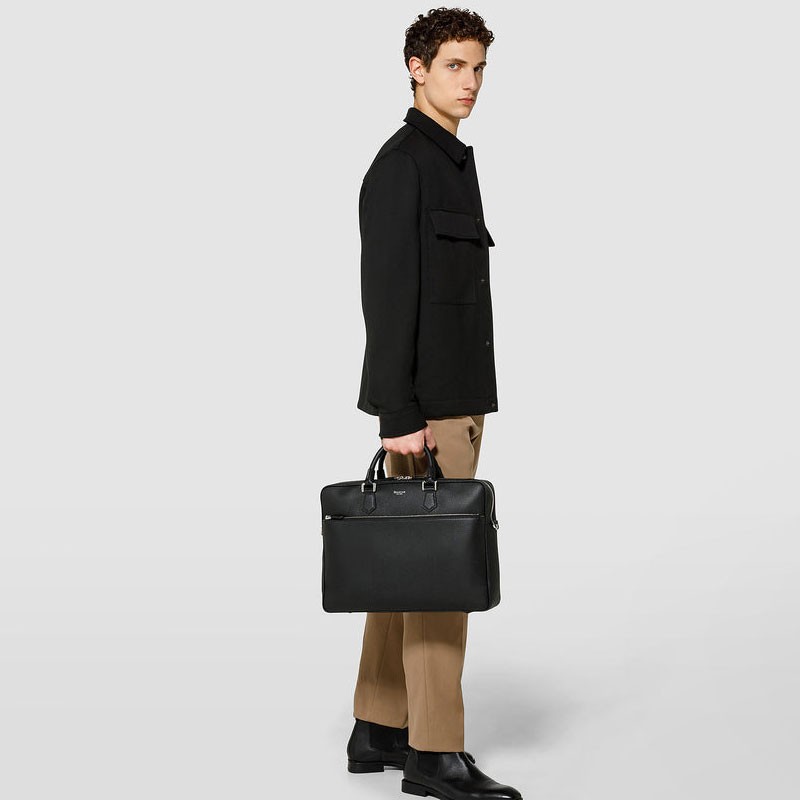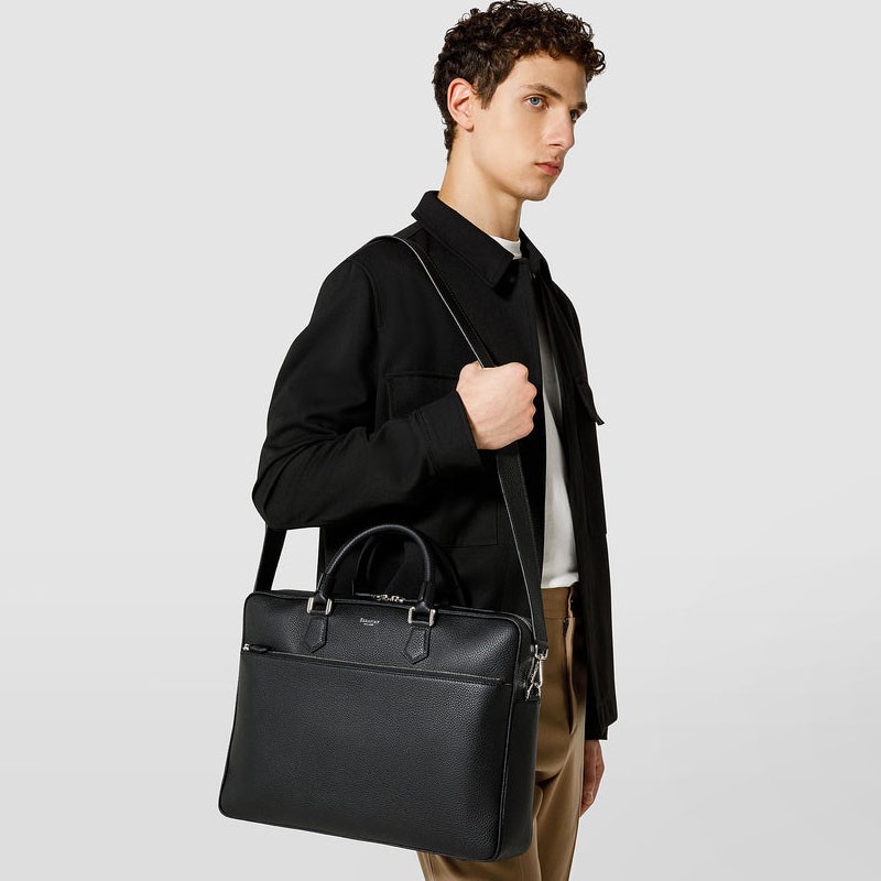 Exterior: single two-way zip, trolley handle at the back, zipped front pocket, double handles, shoulder strap attachments. Interior: single compartment with padded laptop pocket, two smartphone pockets, inside pocket, three pen holders, zipped pocket. Customisable and detachable address tag. Adjustable and detachable leather strap. Microfibre lining. Palladium finish hardware.