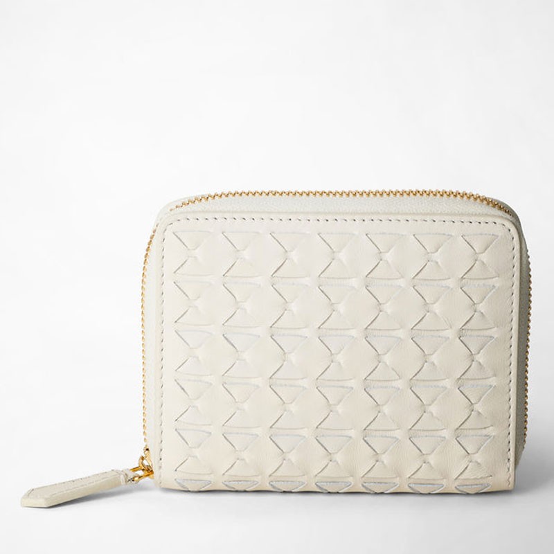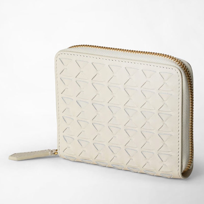 Exterior: single zip fastening. Interior: three card slots, one receipt pocket, coin pouch and note compartment.Palladium finish hardware.