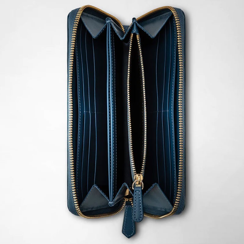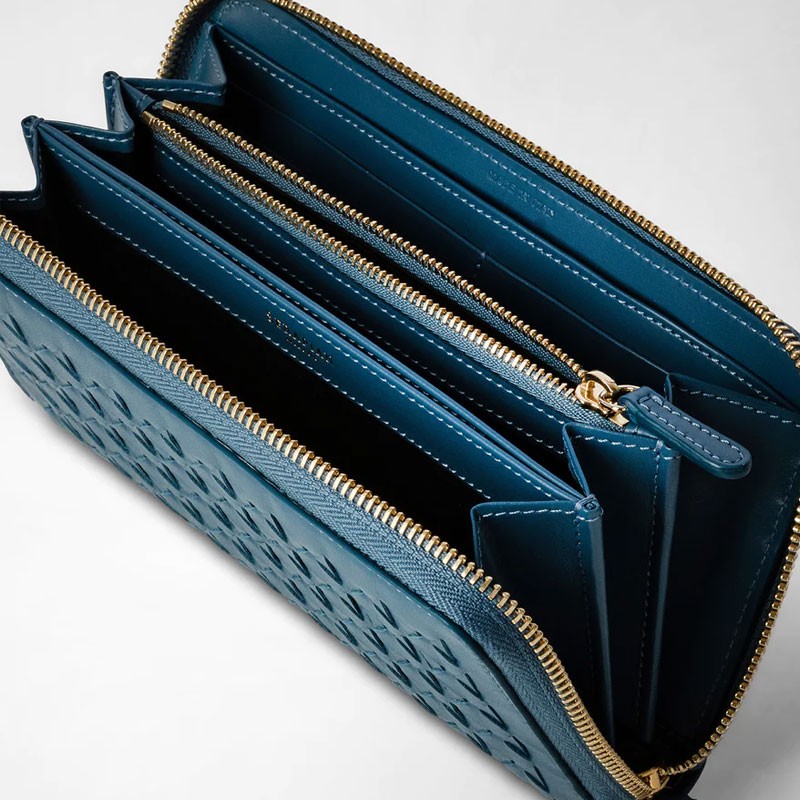 Exterior: front flap with snap fastening. One pocket under front flap. Interior: two compartments and a separate central zipped pocket. Six card slots in each compartment, plus one pocket. Palladium finish hardware.