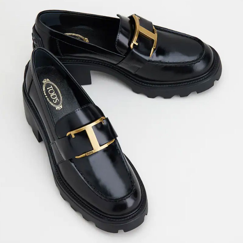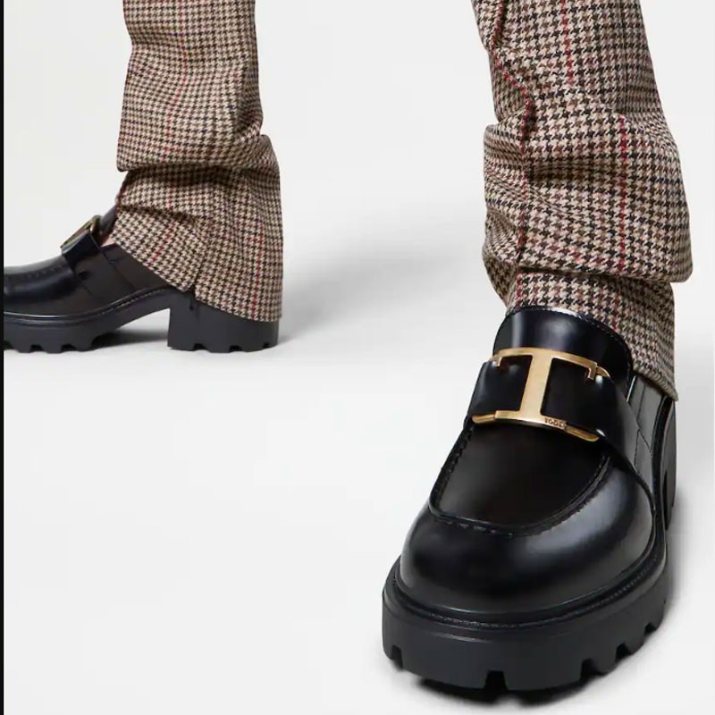 Loafers in elegant semi-shiny leather with a band and branded metal T Timeless accessory, rubber pebble detailing on the heel and rubber lugged outsole.