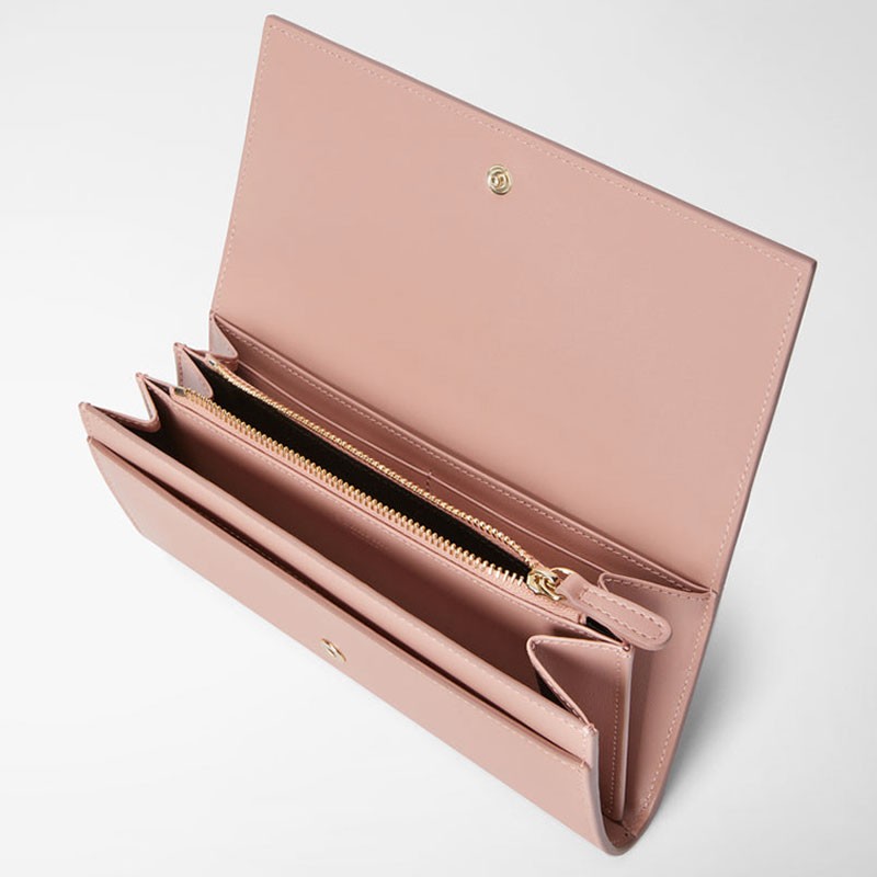 Exterior: front flap with snap fastening. One pocket under front flap. Interior: two compartments and a separate central zipped pocket. Six card slots in each compartment, plus one pocket. Palladium finish hardware.