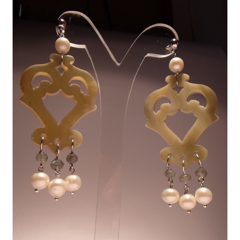 Silver earrings with carved horn, 1st quality freshwater pearls and labradorite. Nickel free