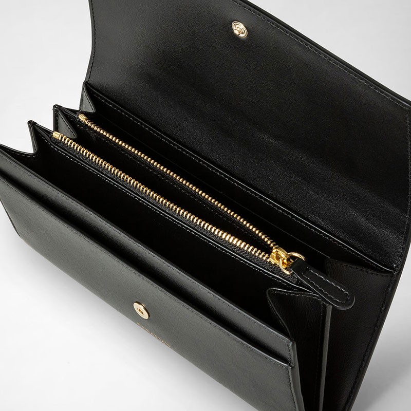 Esterno: patta con chiusura a bottone. Una tasca frontale sotto la patta. Interno: due scomparti principali più una tasca con cerniera separatrice, entrambi con 6 slot porta carte, più una tasca. Metalleria con finitura palladio.