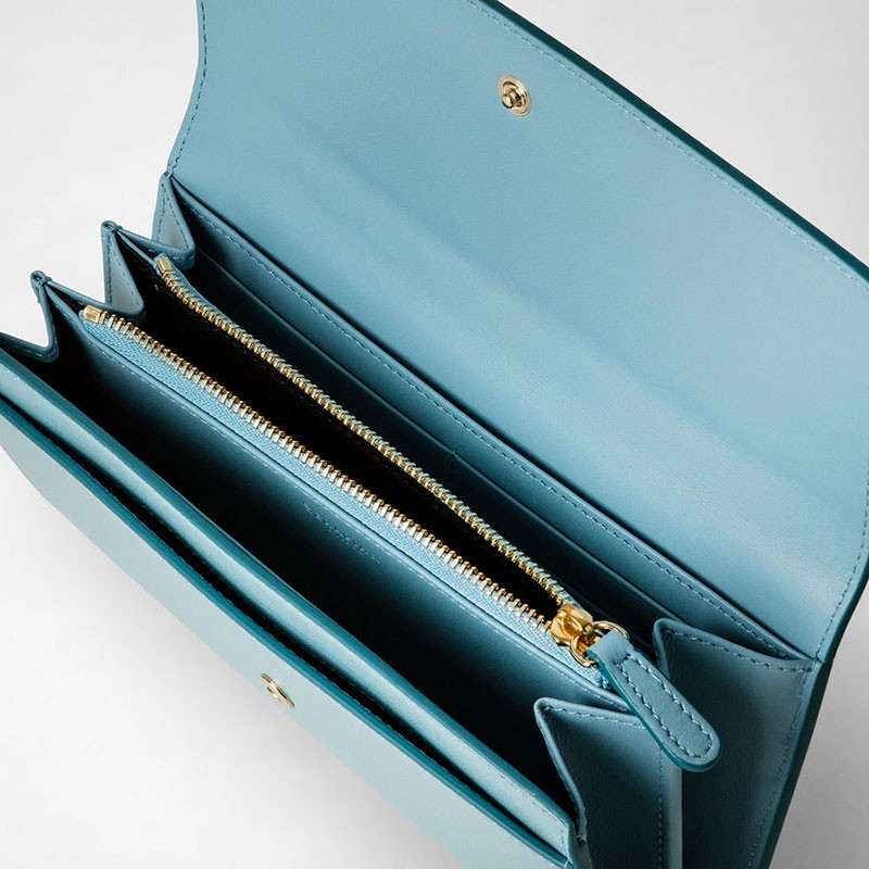Esterno: patta con chiusura a bottone. Una tasca frontale sotto la patta. Interno: due scomparti principali più una tasca con cerniera separatrice, entrambi con 6 slot porta carte, più una tasca. Metalleria con finitura palladio.