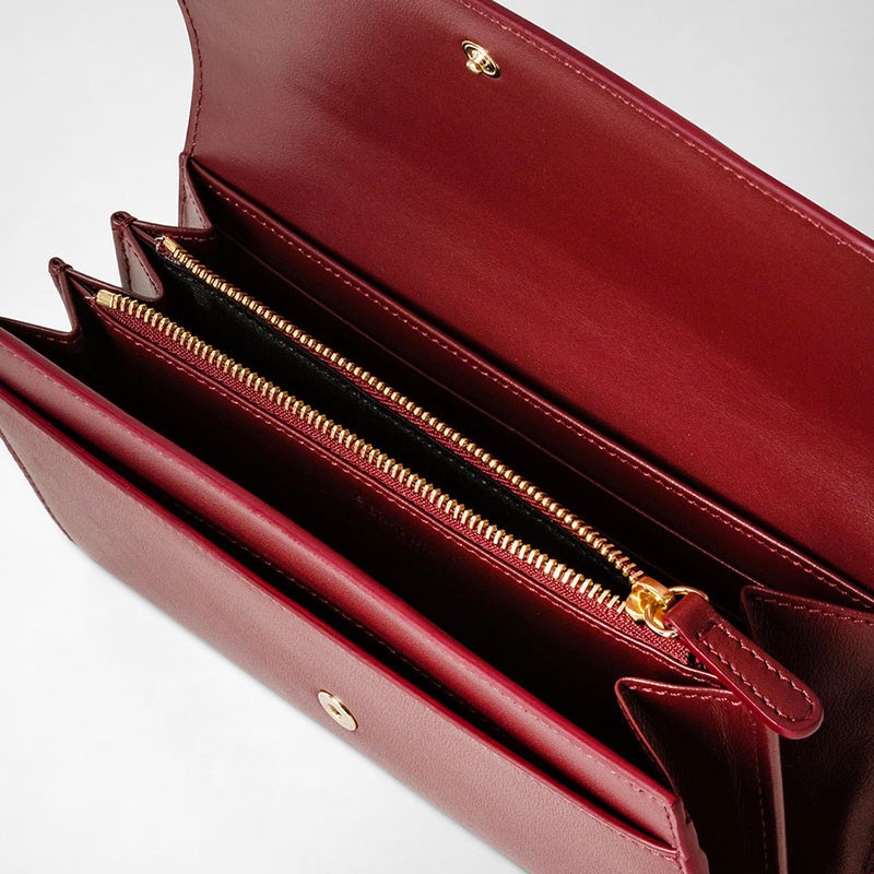 Esterno: patta con chiusura a bottone. Una tasca frontale sotto la patta. Interno: due scomparti principali più una tasca con cerniera separatrice, entrambi con 6 slot porta carte, più una tasca. Metalleria con finitura palladio.