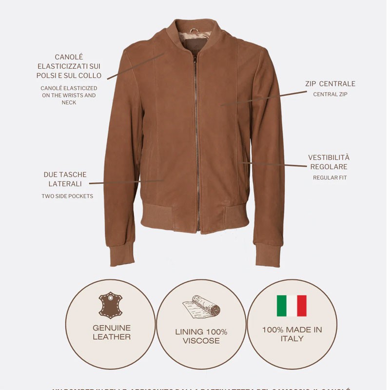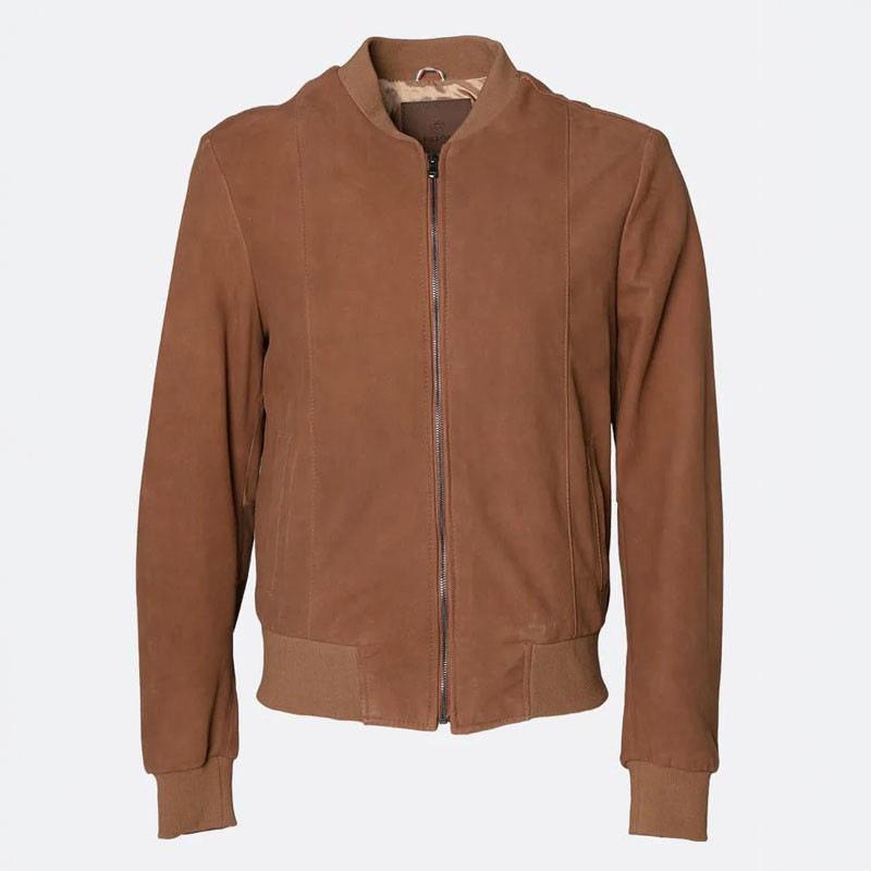 A leather bomber jacket, but with the unique character of suede. The elasticated cuffs, a signature feature of this style, are paired with a high collar and the softness of the leather. This is what makes the Enrico jacket both classic and modern at the same time.