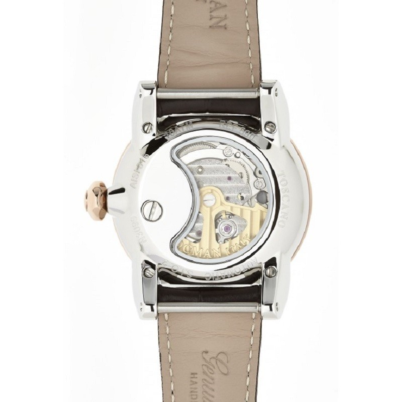 オートマチック、裏蓋もシースルー、ダイヤルはマザーオブパールを使ったロックマンならではの高性能、そしてエレガントなメイドインイタリーの逸品です。